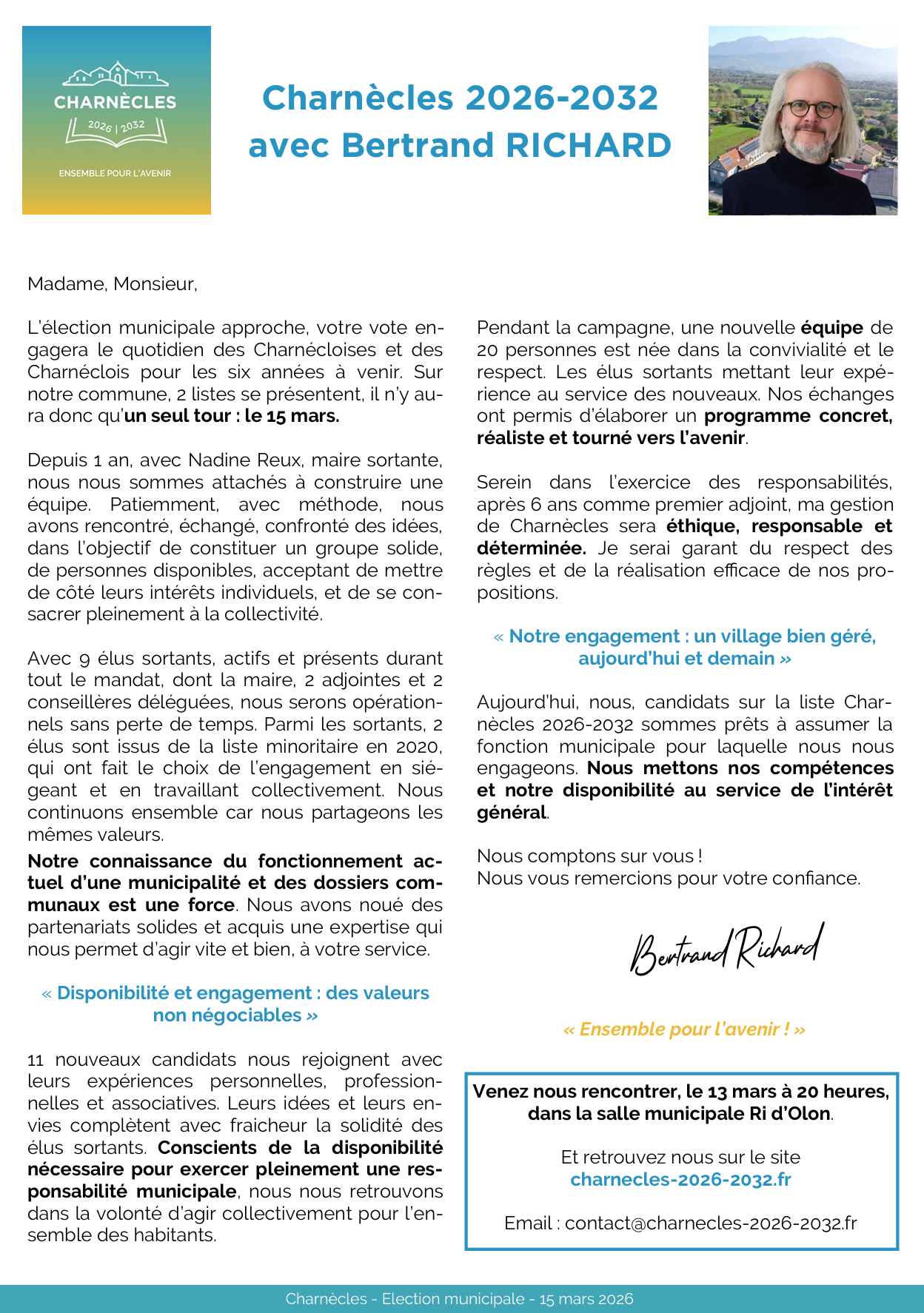 « Entouré d'une solide équipe, entre continuité et renouveau, je souhaite mettre mon expérience des affaires communales et de la conduite de projet au service de Charnècles et des Charnéclois. »